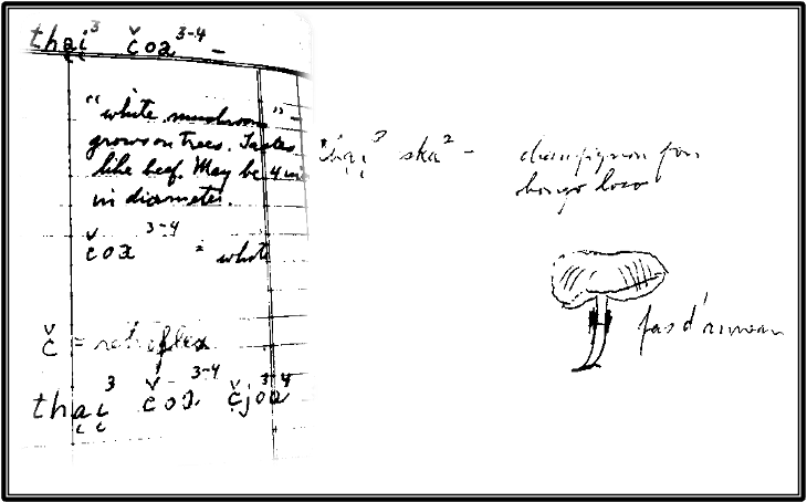 Field notes provide an extensive and invaluable foundation of information about the time spent finding and interpreting the scientific and anthropological meaning of the "Magic Mushrooms". Local anthropologists often accompanied them during their journeys into mountainous Oaxaca. A desire to be accurate and culturally sensitive is illustrated in this field note in which R. Gordon Wasson, already conversant in Spanish and several other languages, sought to understand and speak the Mazatec language.