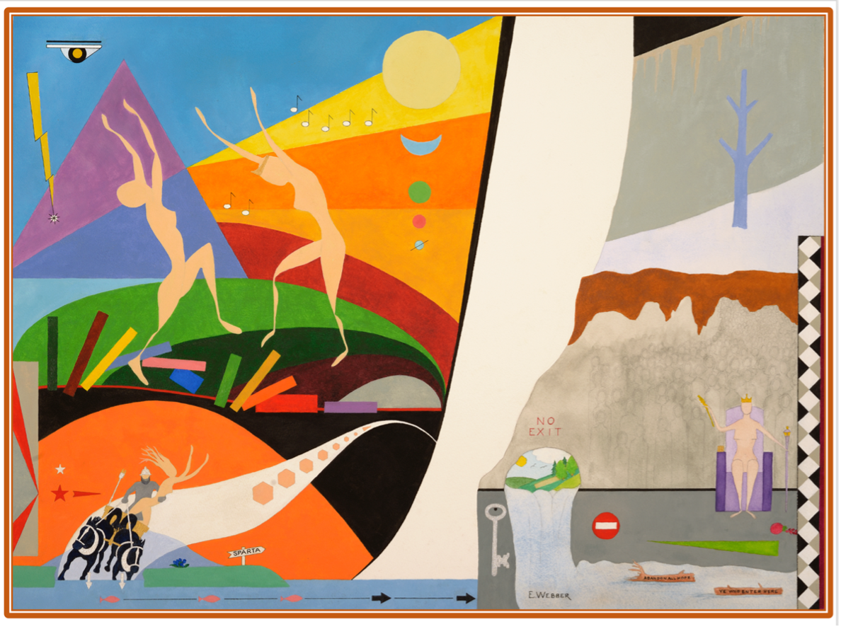 As described by the artist, Everett Webber, M.D. "Persephone was known as the Vegetation Goddess and the Queen of the Underworld. I decided to cover the entire story in this painting, rather than a single moment in time. I would use abstraction, realism, detail, symbolism, and surrealism, with both bright and somber colors, to develop the story, which starts with the abduction of Persephone in the lower left quadrant of the painting. Hades has burst through the Earth of Sicily in front of Mount Etna and swooped down to Persephone, who was picking the blue narcissus. He has his scepter, dark clothing and helmet of invisibility and is about to plunge back into his realm, the Underworld, which is also called Hades. The entrance is through a cave below Sparta. The River Styx forms the border between Earth and the Underworld. It flows in through the mouth of the cave carrying detritus in the form of trees that bear the inscription ABANDON ALL HOPE YE WHO ENTER HERE. There is a red and white traffic sign that signifies ‘Do Not Enter.’ NO EXIT is written above the cave entrance.