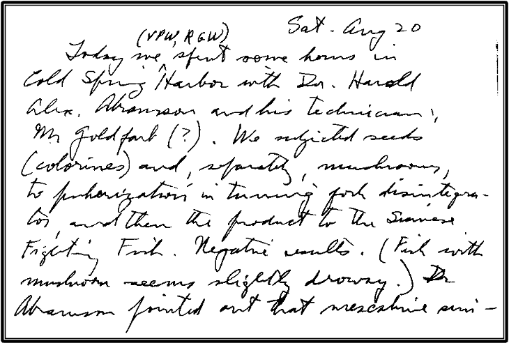 And here he describes testing the content of the mushrooms using Dr. Harold Abramson’s Siamese fighting fish assay for psychoactive substances. That contact is noteworthy since Abramson was a major participant in the CIA’s MK ULTRA mind-control program.