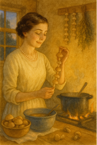 That evening she seasoned the soup with the fungi, she garnished the meat with other fungi. Yet others she threaded together and strung up to dry, for winter use as she said. My discomfiture was complete. That night I ate nothing with mushrooms in it. Frantic and deeply hurt, I was led to wild ideas: I told her that I would wake up a widower.